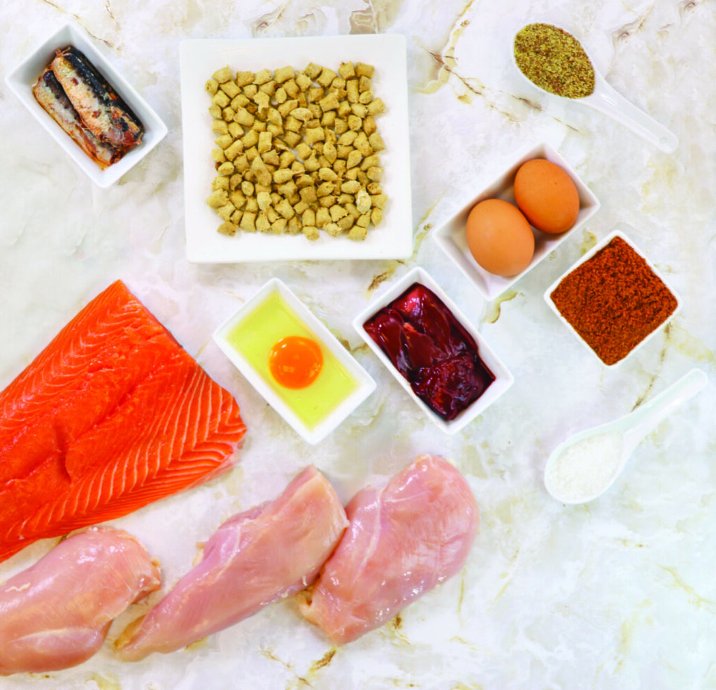 Medicus: Salmon, Chicken, Chicken Liver, Egg, Flaxseed, Sardines, Ground Krill, Sea Salt, Potassium Salt, Ground Egg Shell, Mixed Tocopherols, Zinc Proteinate, Niacin, Riboflavin, Thiamine, Vitamin B12, Pyridoxine, Folic Acid, & Kelp