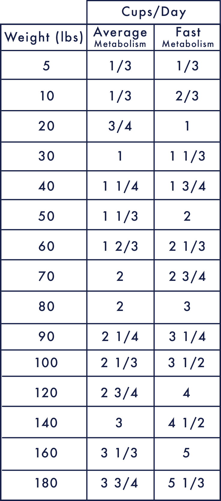 Always consult your veterinarian before introducing this diet to your dog. Start with these daily feeding guidelines and follow your veterinarian’s suggestions about the number of meals per day and whether the daily recommendation is right for your dog.